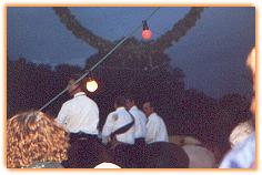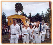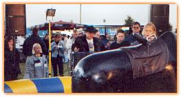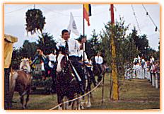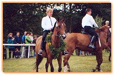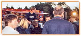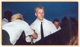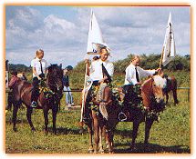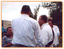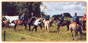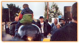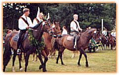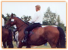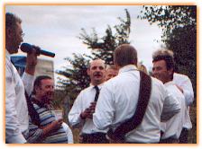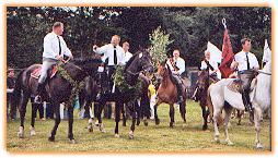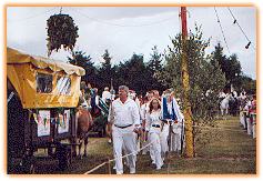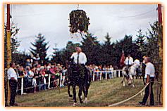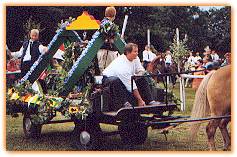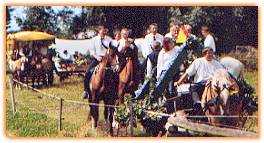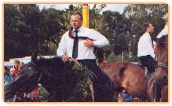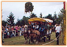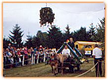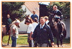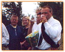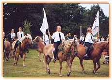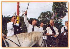 Webcam | 11. August 2001 Das Tonnenabschlagen in unserem Ostseebad. Eigentlich bräuchte dieses Highlight eine ganze HP für sich. Seit vielen vielen Jahren wird dieses Fest als Volksfest in unserem Ort begangen. Man könnte lange und aufregende Geschichten dazu schreiben. Dies allerdings liegt nicht in unserer Hand. Zu sagen wäre nur, daß der Tonnenbund Dierhagen e. V. als Hauptinitiator dieser Veranstaltung seit 1978 existiert und dieses Fest seit damals ohne Unterbrechung und über drei Tage gefeiert wird. Da die anderen Orte auf dem Fischland / Darß dieses Volksfest vor uns begehen, wir also der letzte Ort in der Kette sind, haben wir immer ein wenig mit den Besucherzahlen zu kämpfen. Eine zündende Idee mußte geboren werden, um das Publikum auch weiterhin neugierig zu halten. So erweckten wir, das in unserer Region einzigartige "Flutlichttonnenabschlagen". Wo andere aufhören, fangen wir erst an :-) Und wir müssen sagen, wir fahren sehr gut damit. Dieses Jahr warteten auf die Besucher besonders viele Highlights. Man konnte losen und eine Reise gewinnen, indem man auf den zu erwartenden Tonnenkönig setzte, den Krammarkt durchstöbern, Schießbuden, Kinderkarussels und weitere Losbuden unsicher machen, seinen Gaumen mit Köstlichkeiten erfreuen, im Festzelt tanzen auf einem elektrischen Bullen sein Können beweisen - den Besten winkten ebenfalls satte Preise, am Kindertonnenabschlagen teilnehmen, oder einfach nur die Seele baumeln lassen. Doch nun schaut selbst und macht Euch ein Bild und für Diejenigen die es nicht wissen sollten: Es galt den Boden der Tonne zu zerschlagen (Bodenkönig), danach mußten alle Stäben der Tonne abgehaun werden (Stäbenkönig) und zu guter Letzt das Kreuz (Tonnenkönig) Nach einem wunderschönen Umzug (23 Reiter, 5 Nachwuchsreiterinnen, einem Kremser für die Veteranen, dem Barther Spielmanzug, dem Tonnenwagen, einem Wagen für die Kinder und den Fahnenreitern) durch unser Dorf, ritt und fuhr das Gefolge um 17:30 Uhr auf dem Festplatz ein. Bis 21:45 Uhr dauerte das ganze Spektakel und danach wurde bei heißen Rythmen und kühlen Getränken getanzt bis in die frühen Morgenstunden. ![]() Bei Falko Kriegsheim in Dändorf war Treffpunkt. Dort wurden die benötigten Pferde stationiert, gesattelt, der Umzug formiert, letzte Absprachen getätigt und das Mittagessen eingenommen.