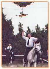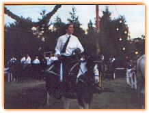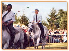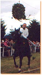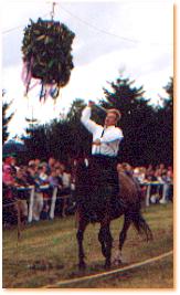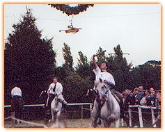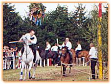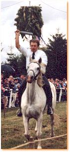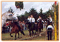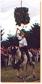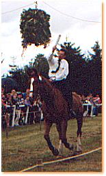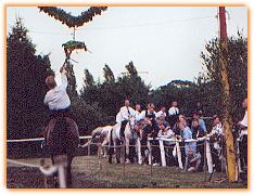Probefahnentragen unseres Nachwuchses. ![]() Letzte prüfende Handgriffe unseres Theo's. ![]() ![]() Sehen sie nicht schön aus, die Pferde und Wagen? ![]() Amigo (Ponywallach) das Erste Mal dabei. Er ist noch ein wenig aufgeregt. ![]() Unseren guten Jacob kann nichts erschüttern, er ist ein alter Hase und hatte schon ganz andere Fuhren :-) ![]() Großer Aufbruch! ![]() Auch den Mädchen stand die Aufregung in's Gesicht geschrieben. Schließlich sollte man ja hinterher stolz auf sie sein ;-) ![]() Hier sind wir schon beim Einmarschieren. Der Spielmanzug war wirklich eine Augenweide. Besser hätten sie es nicht machen können. Da hat wirklich alles gestimmt!!! ![]() Die Reiter. ![]() Die drei alten Könige. ![]() Unsere Mädchen! Im Bild Jana und Pauli. ![]() Axel Wachholz, der Kutscher der Tonne, ist der Vater von unserer Lisa. ![]() Usere Pferde, l. Mario Egner auf Madonna und r. Hartmut Metzner auf Astor. ![]() Gibsy und Don als Gespannpferde, gefahren von Theo Schulz, der uns schon 6 Jahre die Treue hält. Rechts daneben Klaus Penndorf. Er hat vielen Tonnenbrüdern in den 70 zigern und 80 zigern das Reiten gelernt und große Aktien an der Wiederbelebung des Tonnenabschlagens. ![]() Aufmarsch unter der Tonne. ![]() ![]() Die Barther werden unser Fest auch im kommenden Jahr wieder musikalisch begleiten. ![]() Axel mit dem leeren Tonnenwagen :-) ![]() Theo mit voller Fuhre. ![]() Unsere Kinder, die zukünftigen Tonnenschwestern ;-) ![]() ![]() Und los geht's mit dem Spektakel. Links Guido, rechts Svenni (Sven Melchert, Papa von Dennis und Hauptsponsor unseres Reiterhofes) ![]() Links Mario und rechts Sönke unser Gastreiter. Vor zwei Jahren haben er und seine Freundin Petra bei uns auf dem Reiterhof das Reiten gelernt. Seitdem besuchen die Beiden uns hier an der Küste so oft es ihnen möglich ist und haben sich mitlerweile den Traum eines eigenen Pferdes erfüllt. Sönke und Petra hat unser Flutlichttonnenabschlagen so gut gefallen, daß sie beschlossen haben auch im nächsten Jahr wieder dabei zu sein, wenn es heißt "Gut Schlag". ![]() Mandy Kriegsheim links und Hartmut Metzner, genannt Fritzi, auf Astor rechts. ![]() ![]() Guido auf Gina, holt aus und trifft. Rechts im Bild kommt das Gefolge mit dem so ebend gefallenen Bodenkönig 2001. Tja nun ist man nicht nur der Chef des Hofes, nein nein, sondern auch noch ein König in Amt und Würden ;-) ![]() Ein dreifaches "Gut Schlag" besiegelt sein Los. Hoch soll er leben - Schnaps muß er geben :-) ![]() Der Bodenkönig des vergangenen Jahres übergibt seine Scherpe dem neuen. ![]() Huch erst mal ein Säft auf den Schreck :-) ![]() Der Chef unseres Tonnenbundes Christian Dencker (mittig, dritte v. l.) findet immer ein paar witzige Worte - na gut, solange es ihn nicht selber erwischt. ![]() ![]() Alles meins, ich geb nicht's ab :-) ![]() Beim Ponyreiten gabs kaum eine Pause für unsere fleißigen Kids. ![]() Das muß man ehrlichen Herzens gestehen, sie hatten wirklich alles im Griff. Es klappte ohne irgendwelche Komplikationen. Wir waren sehr stolz auf unsere Mädchen! ![]() Unermüdlich - Runde für Runde und Stunde um Stunde! ![]() Reiter aufgesessen ! ![]() Und schon gings in die nächste Runde. ![]() 92 Pferdehufe fliegen donnernd durch die Bahn. ![]() Einmal Hin - ![]() und wieder zurück! ![]() Dann stand es fest. Elke Richter war unsere neue Stäbenkönigin. ![]() Nach einer kurzen Verschnaufpause für Pferd und Reiter ging es in die letzte und entscheidene Phase. ![]() ![]() Das Flutlicht gab dem ganzen Spektakel ein wirklich romantisches Feeling. Gigantisch - nicht wirklich zu beschreiben, man muß dabei gewesen sein und diese Momente miterlebt haben. ![]() Und manchmal wird ein alter König auch gleich der neue. Der Bodenkönig 2000, Andreas Roloff, wurde Tonnenkönig 2001. ![]() Noch ein wenig sprachlos, aber überglücklich! ![]() Das Bullriding erfreute sich ebenfalls größter Beliebtheit. ![]() Ob Alt oder Jung, dieses Fieber erfaßte sie alle. ![]() In jedem Menschen steckt halt ein kleiner Cowboy :-) ![]() Schließlich muß man nicht unbedingt schon freihändig laufen können, um auf einem Bullen zu sitzen ;-) ![]() Ja, wie eingangs schon erwähnt gibt dieses Fest genügend Stoff für spannende endlos währende Geschichten. Wer also am zweiten Wochenende im August nicht's Besseres vor hat oder auch nur in der näheren Umgebung verweilt, der sollte dieses Ereignis keinesfalls versäumen. Sie werden es nicht bereuen, das können Sie uns glauben! zurück | |||||||||||||||||||||||||||